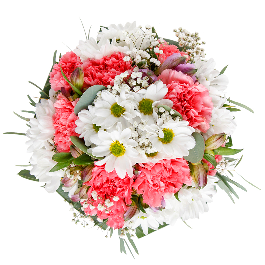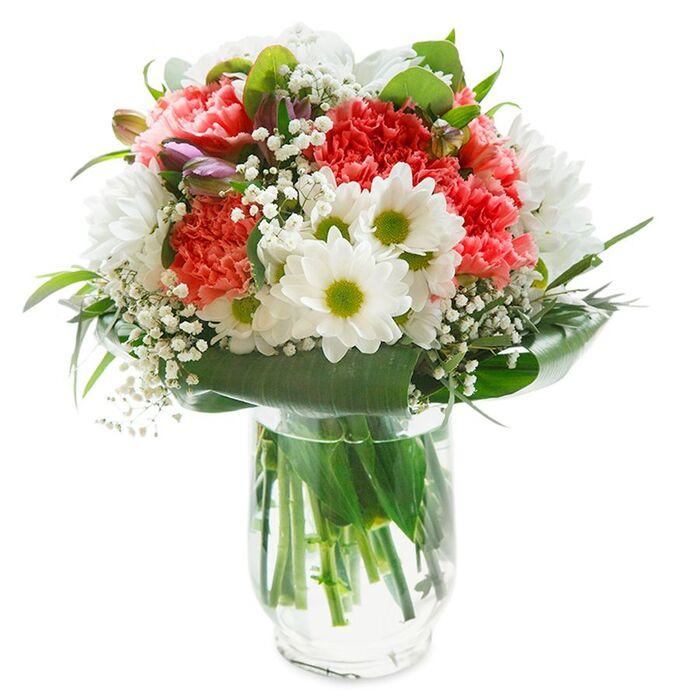 Our stunning bouquet blends sophistication with a warm, inviting style. Adorned with crisp snow-white chrysanthemums, airy gypsophila, and soft light pink carnations nestled in vibrant aspidistra leaves, this arrangement radiates natural beauty and refined style.